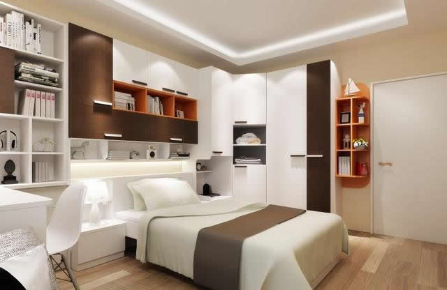 白色門板清新優雅,與深色胡桃木碰撞出不一樣的視覺享受,且更顯時尚大方;一門到頂式設計與房間尺寸契合,實用大氣;角落處吊柜的設計方便小件物品的拿取。