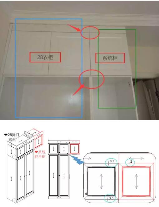 你們發現什么問題了嗎?其實主要問題就是衣柜和系統柜組合訂單的門板上下門縫高度沒有對齊!為什么門縫會對不齊呢?造成門縫不對齊是因為衣柜門板的縮尺與系統柜門板的縮尺規則是不一樣的,再加上我們衣柜和系統是分開下單,分開審核,那么我們就沒辦法核對同組合的柜體的門縫是否對齊。所以這一個問題可能會導致補單!設計大大們請留意了!!!當衣柜頂柜與系統柜組合搭配需分開下單時,建議在系統柜(線框圖或報價單)備注“旁邊有衣柜頂柜,單號為xxxxxx,提醒修改門板高度,對齊門縫”的方式來避免此類補單!